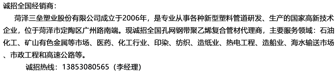 菏澤三壘塑業(yè)股份有限公司專業(yè)從事各種新型塑料管道研發(fā)和生產(chǎn),重點(diǎn)研發(fā)了孔網(wǎng)鋼帶聚乙烯復(fù)合管材